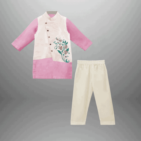 Boy’s 3 piece set of Pink Kurta, Off white Pajama and asymmetric front waistcoat -RKFCW562