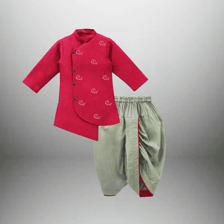 Boy’s 2 piece set of Olive Gray colored Dhoti and asymmetric front kurta -RKFCW561