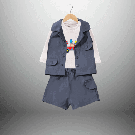 Boy’s Blue 3 piece set with white t-shirt, shorts and a sleeveless jacket-RKFCW488