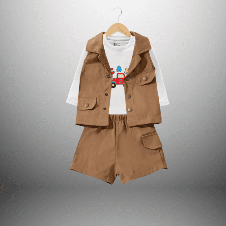 Boy’s Tan Brown 3 piece set with white t-shirt, shorts and a sleeveless jacket-RKFCW487