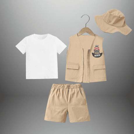 Boy’s 3 piece set of Beige shorts, Zippered sleeveless jacket and T-Shirt with a free hat-RKFCW538