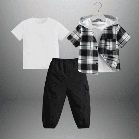 Boy’s 3 piece set of Black Cargo pant ,Black and white hooded Checkered shirt with a t-shirt-RKFCW545
