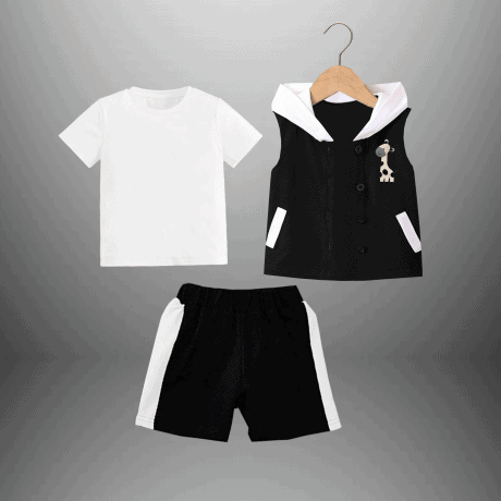 Boy’s 3 piece set of Black & white shorts , Sleeveless hooded jacket wih buttons and T-shirt-RKFCW533