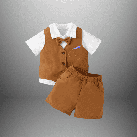 Boy’s 3 piece set of Tan Brown shorts , waistcoat and White Shirt with Bow-RKFCW535