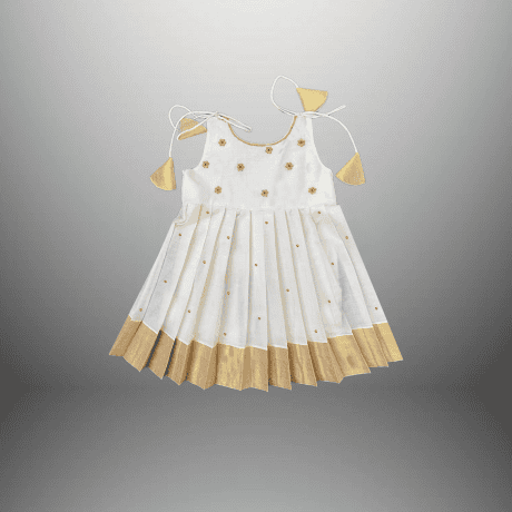 Girl’s off white and golden kasavu cotton dress with shoulder tie – RKFCW568