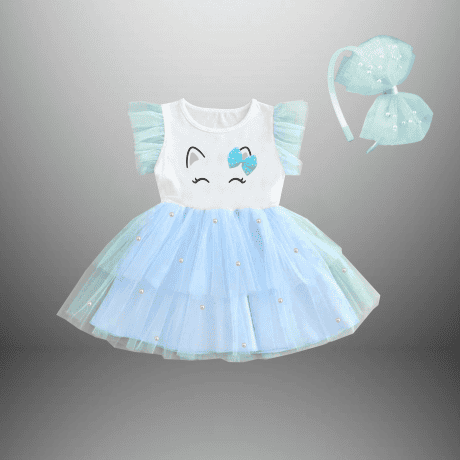 Girl’s white and sky blue party dress with pearl embellishment and a free hair band- RKFCW575