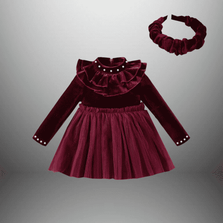 Girl’s Wine Red Velvet & Net Full Sleeve dress with High Neck and frills and Pearl embellishment-RKFCW513