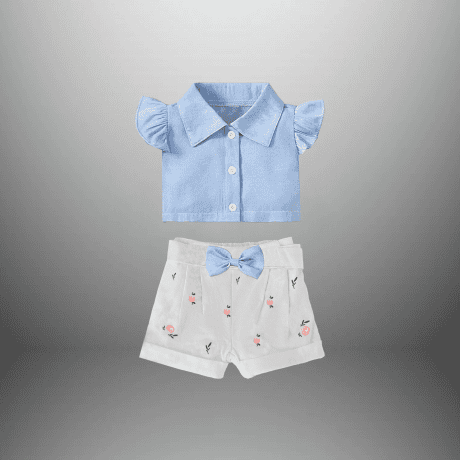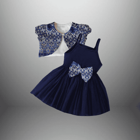 Girl’s Blue Printed Outer and a flared Dress with a Bow-RKFCW548