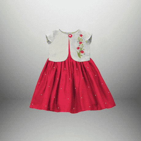 Girl’s Two piece set of Olive gray Outer with Red sleeveless Flared Dress-RKFCW563