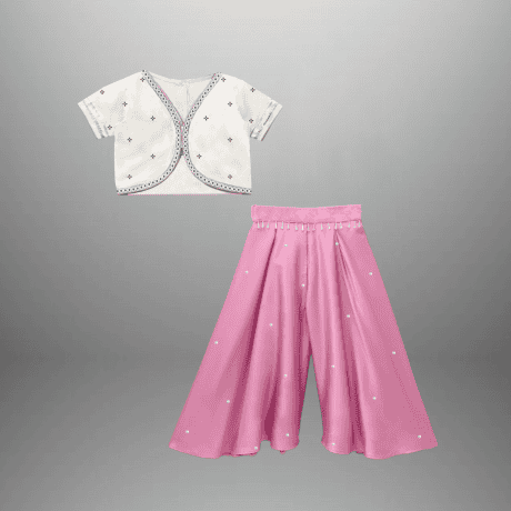 Girl’s Two piece set of Pink Pleated Palazzo with Off White Blouson Crop Top-RKFCW564