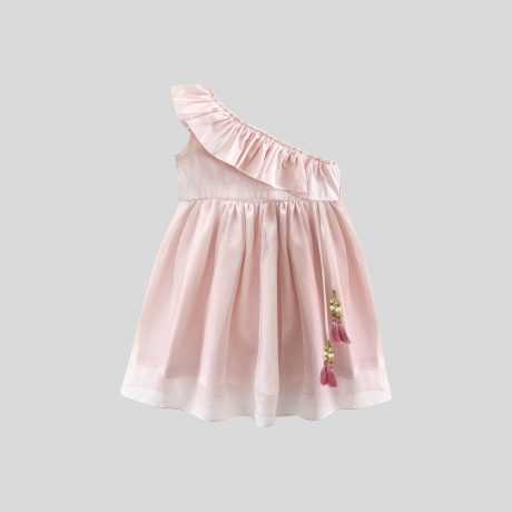 Girls pink party one shoulder frill top and net overlay lehenga set – RKFCW293
