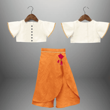 Girl’s stylish 2 piece set of orange skirt style palazzo and frilled white top-RKFCW498