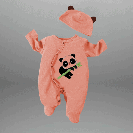 Toddler’s Peach Romper with cute lazy panda motif and a free cap-RKFCTT105