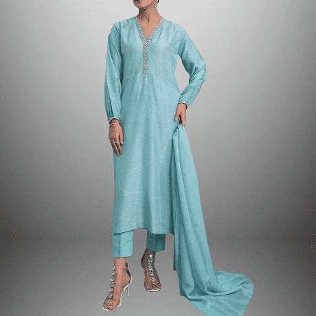 Women’s Light Blue kurti of V neck with Pant and Dupatta-RWKS076