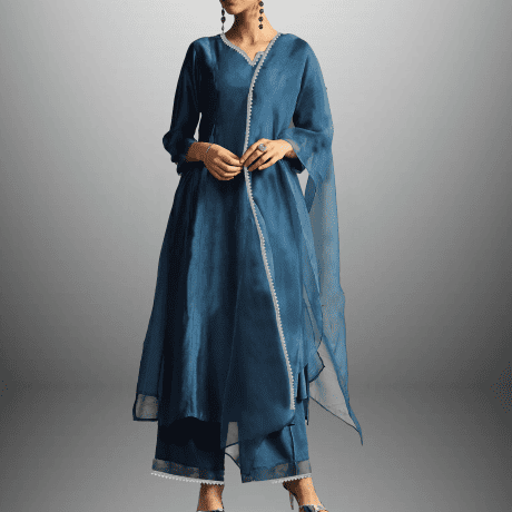 Women’s Organza Blue Kurti with lace border with a Pant and Dupatta-RWKS074