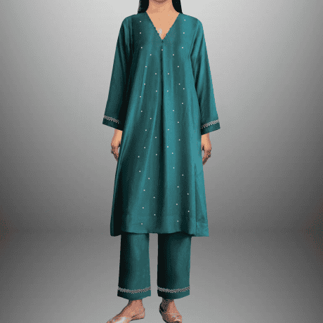 Women’s Green colored sequince & lace embellished Kurti with pant -RWKS091