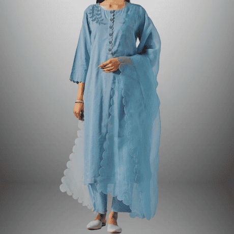 Women’s Ice-Blue Calf length Kurti with Front embroidery and Scalloped dupatta with Pant-RWKS092