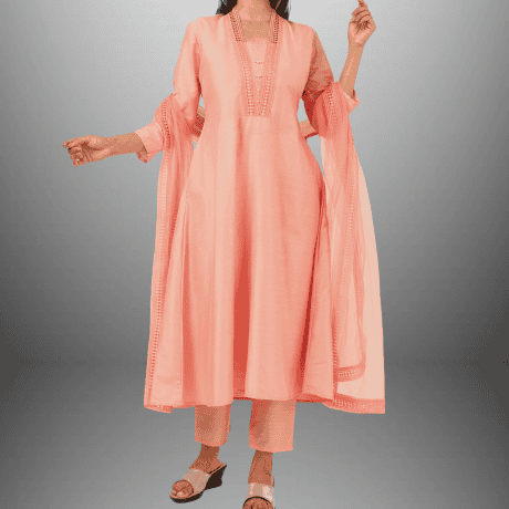 Women’s Peach Pink Kurti with Lace and Pleated front Detailings with Same color pant and Lace Embellished Dupatta-RWKS097