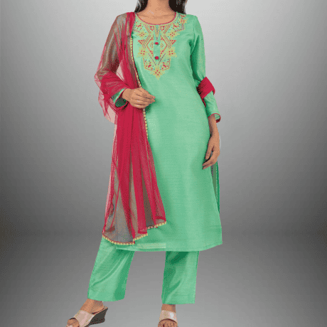 Women’s Pista Green Kurti with Front Embroidery with Pant and Contrast Dupatta-RWKS096