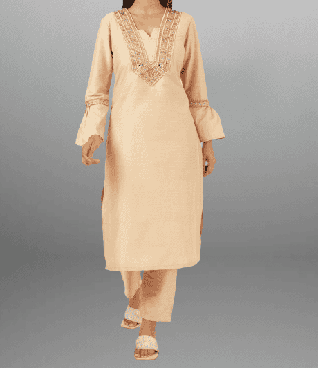 Women’s Beige Kurti with Embroidered neck Patch and bell sleeves with Bottom-RWKS094