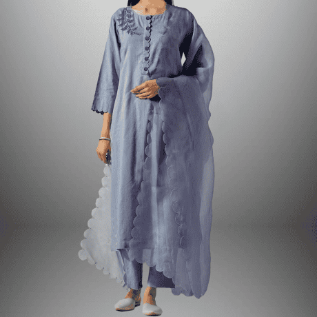 Women’s lavender Calf length Kurti with Front embroidery and Scalloped dupatta with Pant-RWKS093
