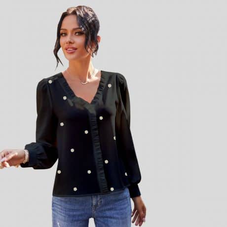 Black V-neck Frill Trim Puff Sleeve Blouse-RCT050
