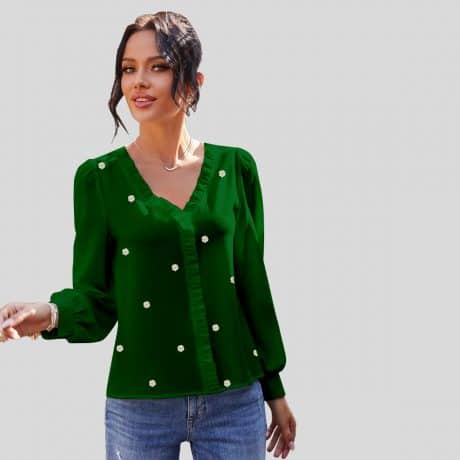Green V-neck Frill Trim Puff Sleeve Blouse-RCT049