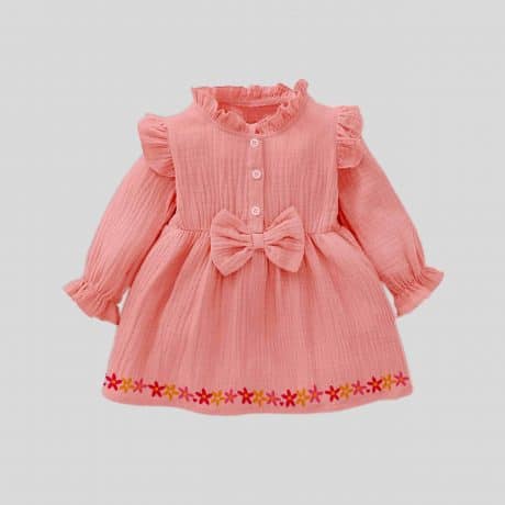 Girls delicate pink frill collar full sleeve dress with a cute bow and floral print trim- RKFCW186