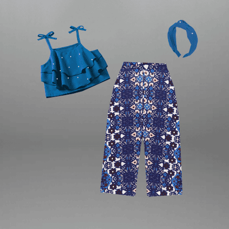 Girl’s Two piece set of blue sleeveless frilled top with pearl embellishment and Printed palazzo and a free hairband-RKFCW556