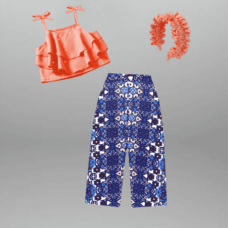 Girl’s Two piece set of Peach sleeveless frilled top with pearl embellishment and Printed palazzo and a free hairband-RKFCW557