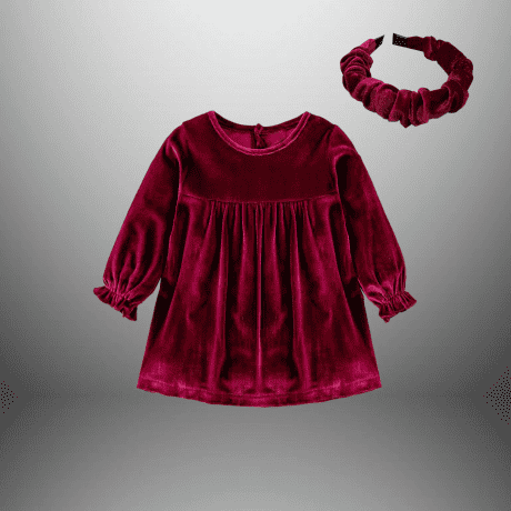 Girl’s Wine Red Velvet Full Sleeve dress with a free hairband-RKFCW514