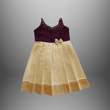 Girl’s off white and golden pretty kasavu cotton dress with floral motif-RKFCW437
