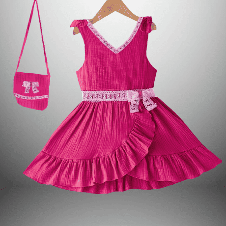 Girl’s pretty pink V neck dress with lace work & frills with free sling bag-RKFCW458