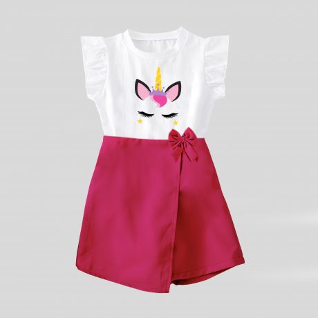 Dark pink jumpsuit with beautifull unicorn print with flap and bow at waist and frilled slevees-RKFCW100
