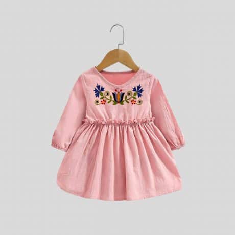 Girls party wear peach net frill dress and frilled sleeves and floral print at neck-RKFCW132
