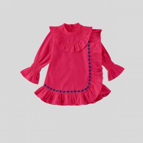 Girls delicate pink frill collar full sleeve dress with a cute bow and floral print trim- RKFCW186