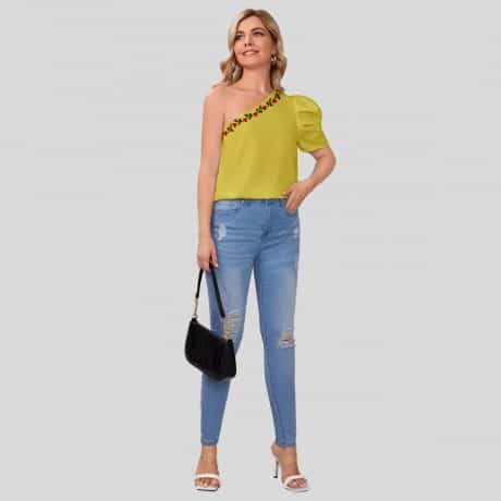Yellow One Shoulder Puff Sleeve Top-RET083B