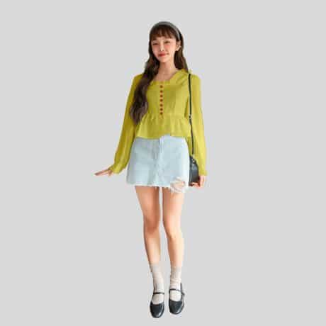 Yellow Ruffle Trim Bishop Sleeve Top-RCT109