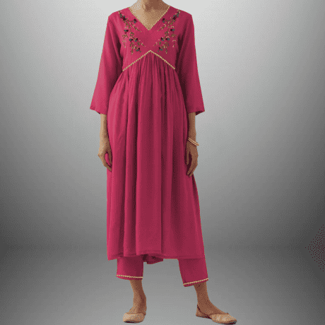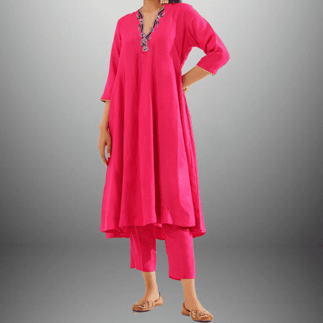 Women’s Bubblegum Pink Kurti set with Blue embroidery on neckline-RWKS051
