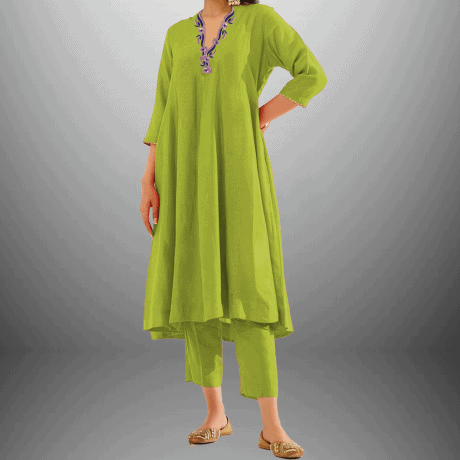 Women’s Lime Green Pink Kurti set with Blue embroidery on neckline-RWKS052