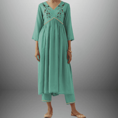 Women’s Mint Green Kurti set with Golden lace border and Embroidery on front-RWKS047