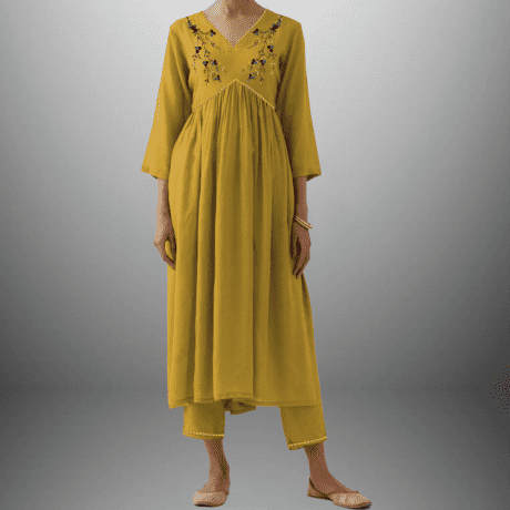 Women’s Mustered Yellow Kurti set with Golden lace border and Embroidery on front-RWKS048