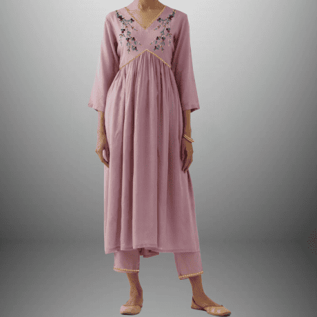 Women’s Lavender Kurti set with Golden lace border and Embroidery on front-RWKS050