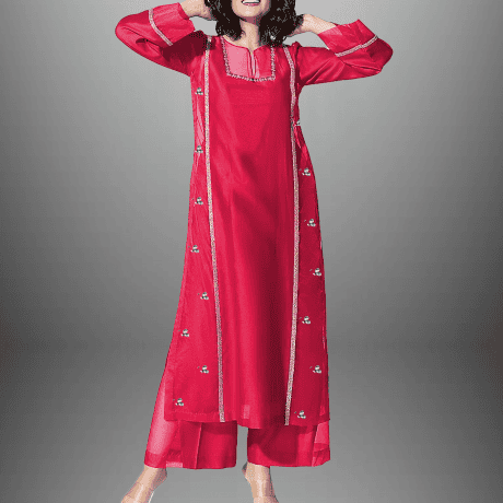 Women’s Cherry red Organza full sleeve kurti set with silver lace and kundan work-RWKS008