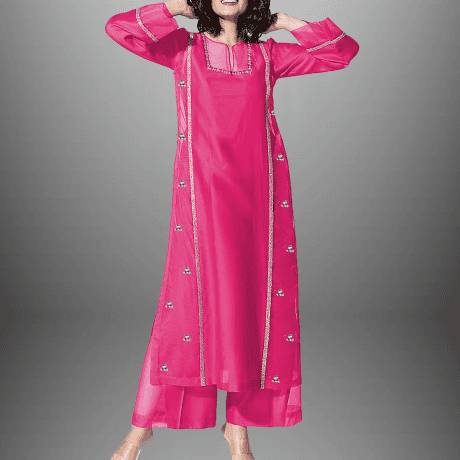 Women’s pink Organza full sleeve kurti set with silver lace and kundan work -RWKS009
