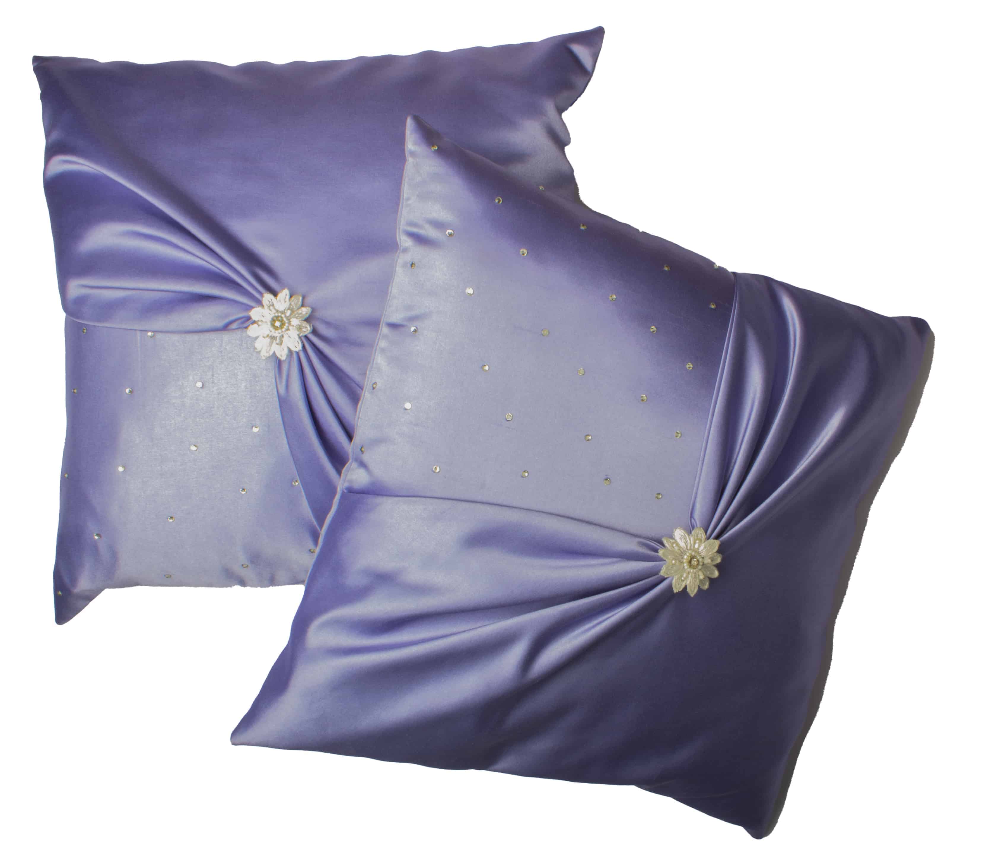 Decorative pair of satin cushion covers with draped bow design and crystal details.